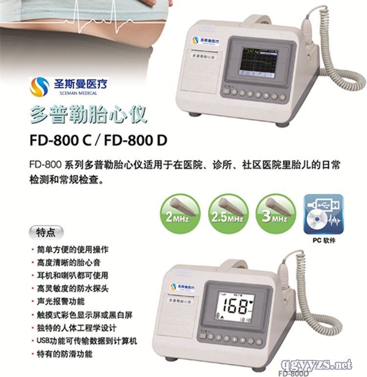 | 補(bǔ)充說明 | FD-800D多普勒胎心儀技術(shù)參數(shù) 音質(zhì)超清晰、聲音洪亮、探頭防干擾并防水的超聲多普勒胎心儀。 便攜式多普勒胎心音儀主要用于對孕齡在12周以后的胎兒心率的檢測,內(nèi)置充電電池可連續(xù)工作8小時(shí); *液晶高亮LED數(shù)字顯示胎心率;顯示工作時(shí)間; 胎心率超范圍報(bào)警和電池電量不足報(bào)警; 內(nèi)置揚(yáng)聲器,配有耳機(jī)插口; *便攜式手提設(shè)計(jì),有專用的探頭和耦合劑放置位。 *超聲頻率:標(biāo)配2MHz防水探頭 (可選配3MHz、5MHz、探頭) *工作模式:三種(手動(dòng)、瞬時(shí)、平均) ●超聲強(qiáng)度:<10mW/cm2 ●電源:直流可充電鎳氫電池 交流 220/110V, 50/60Hz ●尺寸:220mm ×220mm×140mm ●顯示:65mm×50mm 帶背光的顯示 ●FHR測量范圍:50~240bpm● FHR分辨率:1bpm ● FHR準(zhǔn)確率:±1bpm ●功耗:<12W ●重量:2.1Kg 配置:2MHz防水探頭1個(gè),充電器、說明書、合格證、保修卡各一件 |
