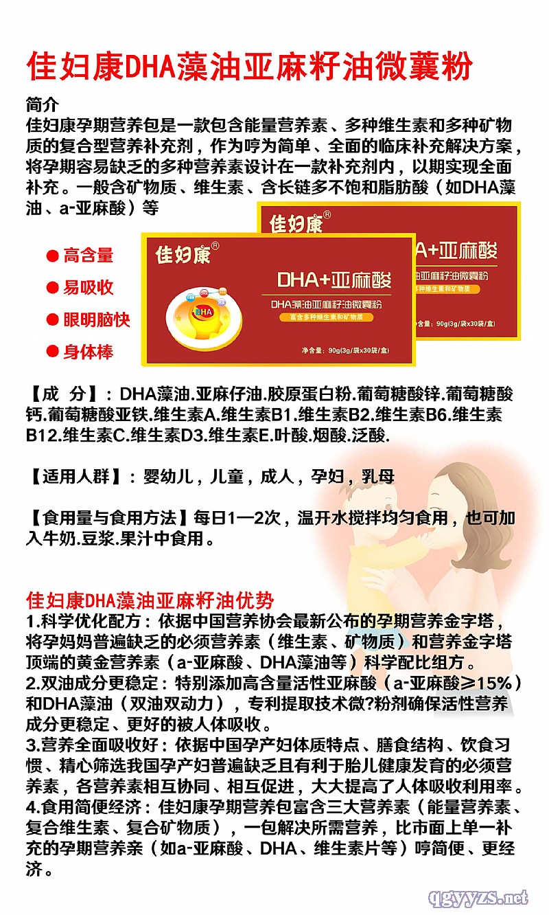 | 補充說明 | 佳婦康DHA藻油亞麻仔油的優(yōu)勢 1.科學優(yōu)化配方:依據(jù)中國營養(yǎng)協(xié)會新公布的孕期營養(yǎng)金字塔,將孕媽媽普遍缺乏的必須營養(yǎng)素(維生素、礦物質(zhì))和營養(yǎng)金字塔頂端的黃金營養(yǎng)素(a-亞麻酸、DHA藻油等)科學配比組方。 2.雙油成分更穩(wěn)定:特別添加高含量活性亞麻酸(a-亞麻酸)和DHA藻油(雙油雙動力),專利提取技術(shù)微䉴粉劑確;钚誀I養(yǎng)成分更穩(wěn)定、更好的被人體吸收。 3.營養(yǎng)吸收好:依據(jù)中國孕產(chǎn)婦體質(zhì)特點、膳食結(jié)構(gòu)、飲食習慣、精心篩選我國孕產(chǎn)婦普遍缺乏且有利于胎兒健康發(fā)育的必須營養(yǎng)素,各營養(yǎng)素相互協(xié)同、相互促進,大大提高了人體吸收利用率。 4.食用簡便經(jīng)濟:佳婦康孕期營養(yǎng)包富含三大營養(yǎng)素(能量營養(yǎng)素、復合維生素、復合礦物質(zhì)),一包解決所需營養(yǎng),比市面上單①補充的孕期營養(yǎng)親(如a-亞麻酸、DHA、維生素片等)哼簡便、更經(jīng)濟。 |