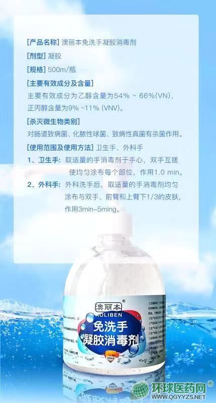 | 補(bǔ)充說(shuō)明 | 【產(chǎn)品名稱(chēng)】澳麗本 免洗手凝膠消毒劑 【劑 型】凝膠 【規(guī) 格】500ml/瓶 【主要有效成分及含量】主要有效成分為乙醇含量為54%~66% (V/V)、正丙醇含量為9%~11%(V/V)。 【殺滅微生物類(lèi)別】對(duì)腸道致病菌、化膿性球菌、致病 性真菌有殺滅作用。 【使用范圍及使用方法】衛(wèi)生手、外科手。 1、衛(wèi)生手:取適量的手消毒劑于手心,雙手互搓使均勻涂布 每個(gè)部位,作用 1.0 min。 2、外科手:外科洗手后,取適量的手消毒劑均勻涂布于雙手、 前臂和上臂下1/3的皮膚,作用3min~5min。 |