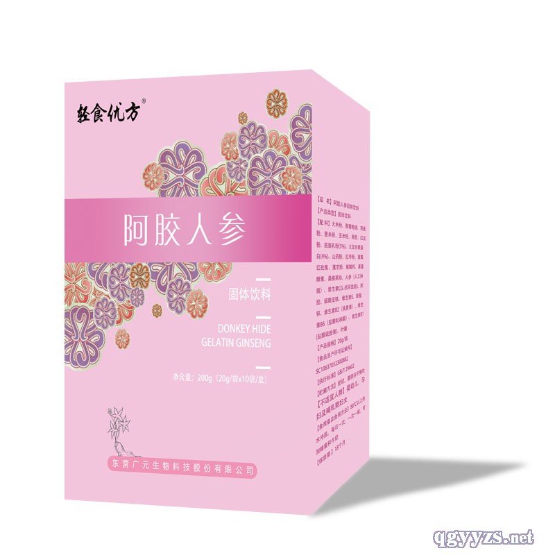 | 補(bǔ)充說(shuō)明 | 阿膠人參固體飲料是東營(yíng)廣元生物科技股份有限公司生產(chǎn)的一款固體飲料,經(jīng)過(guò)公司研究院細(xì)心研究組方,根據(jù)特定人群推出的功能性食品,支持阿膠人參代加工,貼牌業(yè)務(wù)。 |