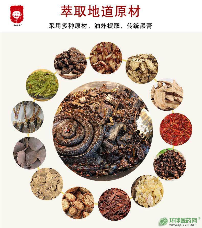 | 主要成分 | 百年狗皮張由制川烏、骨碎補(bǔ)、血竭、沒(méi)藥、丁公滕、霍香、麻黃、制草烏、鹿茸、蜈蚣、桂枝、羌活、三七、紅花、當(dāng)歸、乳香、白芷、海風(fēng)藤、續(xù)斷、川芎、龍骨、麻油等58種名貴中草藥組方。 |
