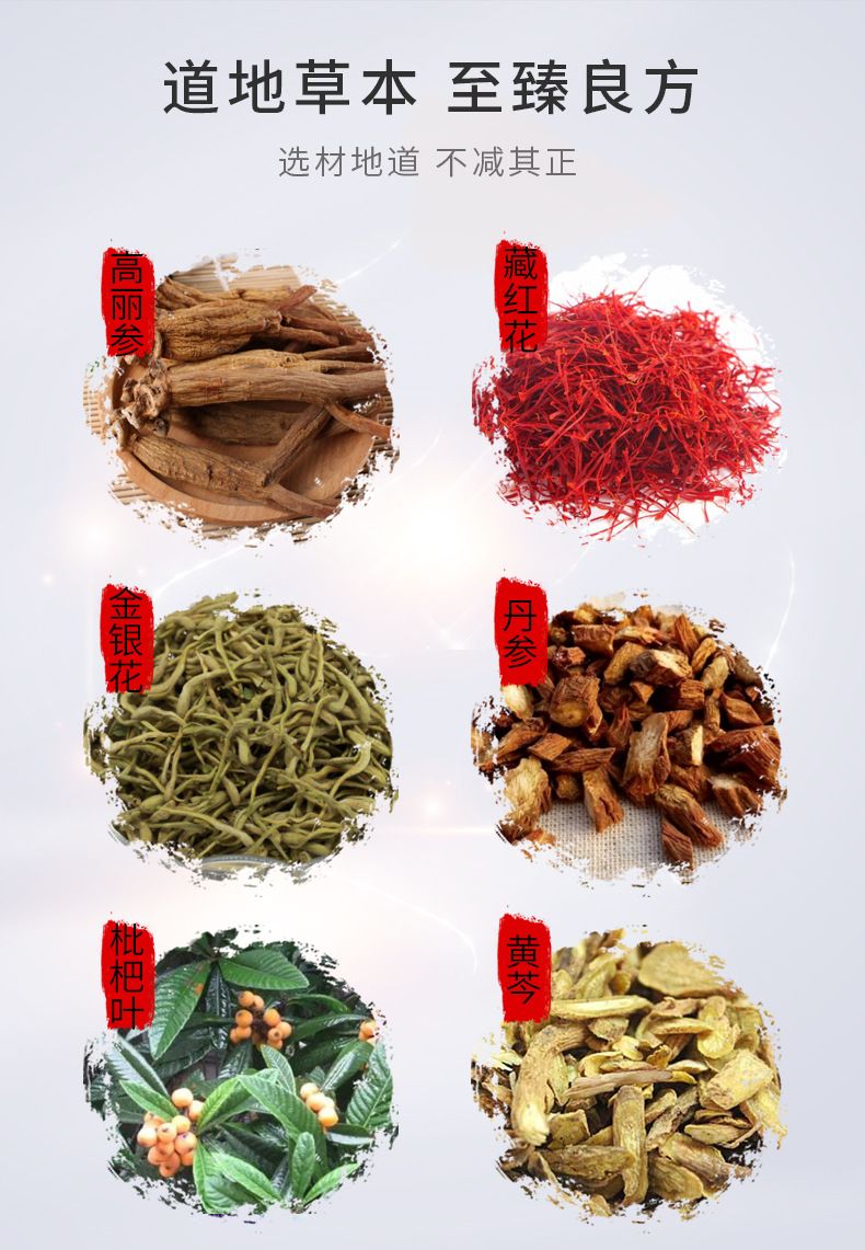 | 主要成分 | 高麗參、藏紅花、金銀花、丹參、連翹、枇杷葉、黃芩、茯苓、知母、黃柏(PbellodendriCbimensisCortex)、山萸肉、甘草、夏枯草、草決明、水楊酸。 |