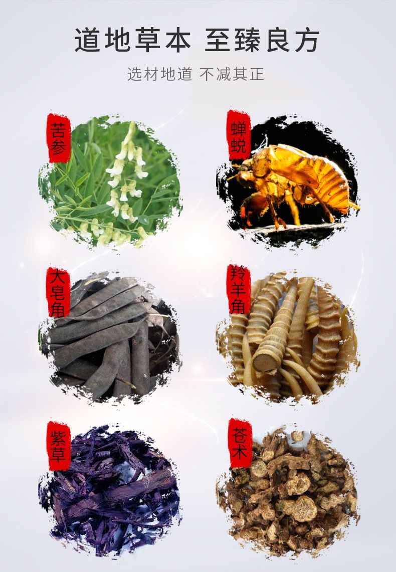 | 主要成分 | 苦參、蟬蛻、大皂角、羚羊角、黃柏、紫草、蒼術(shù)、防風(fēng)、白鮮皮、紅花、地骨皮、黃連、人工牛黃、馬齒莧、白礬、硫磺、冰片、薄荷腦、醋酸氯已定。 |