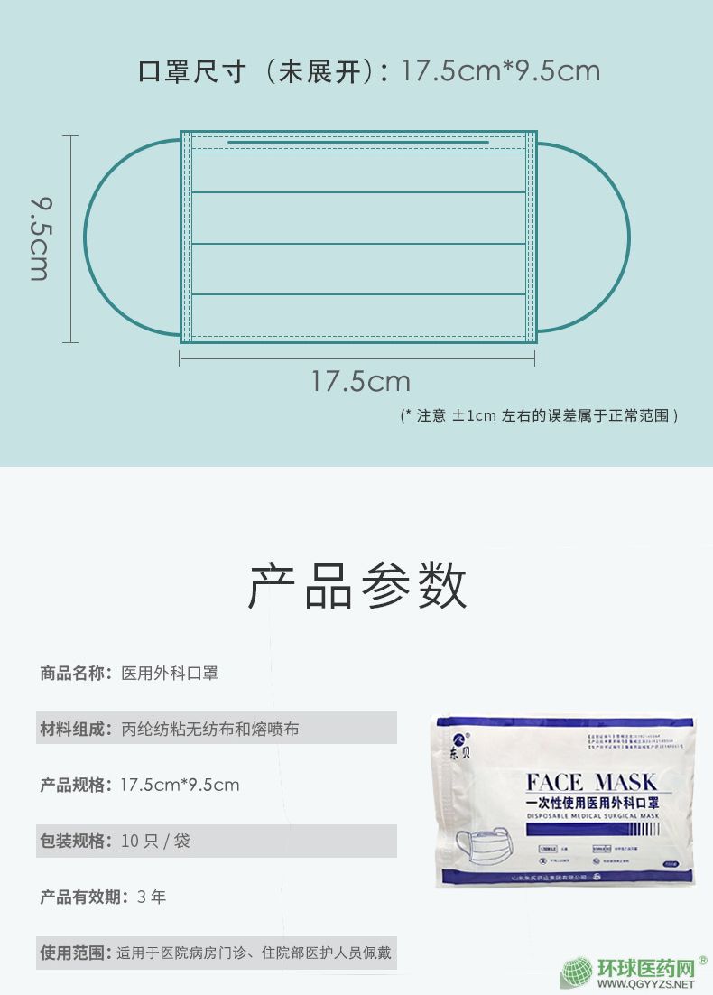 | 主要成分 | 東貝一次性使用醫(yī)用外科口罩由表層、中間層、底層、口罩帶、鼻夾組成,表層材料為聚丙烯紡粘布、中間層材料為聚丙烯噴絲法制成的過濾熔噴布、底層材料為聚丙烯紡粘布、口罩帶為滌綸線和少量氨綸線針織而成、鼻夾為可彎折可定型的聚丙烯制成。 |