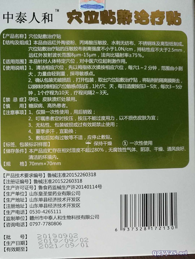 | 使用方法 | 1.清潔相關(guān)穴位,先以拇指依次揉按相應(yīng)穴位,每穴1-2分鐘,范圍由小到大,力量由輕到重,探尋敏感點(diǎn)。 2.確認(rèn)包裝無(wú)破損后,打開包裝,取出穴位貼敷治療貼,將貼劑的隔離膜撕去,以鋼珠對(duì)準(zhǔn)相應(yīng)穴位敏感點(diǎn)貼壓,1片/穴,天,每日適度按壓3-5次,每次3-5分鐘,一個(gè)療程為10天,療程間隔2-3天。 |