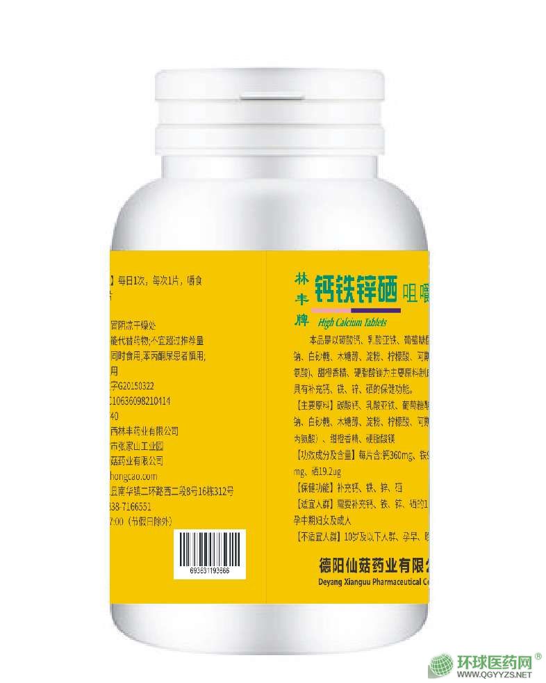 | 主要成分 | 碳酸鈣、乳酸亞鐵、葡萄糖酸鋅、亞硒酸鈉,白砂糖,木糖醇、淀粉、檸檬酸、阿斯巴甜(含本丙氨酸)、甜橙香精、硬脂酸鎂 |