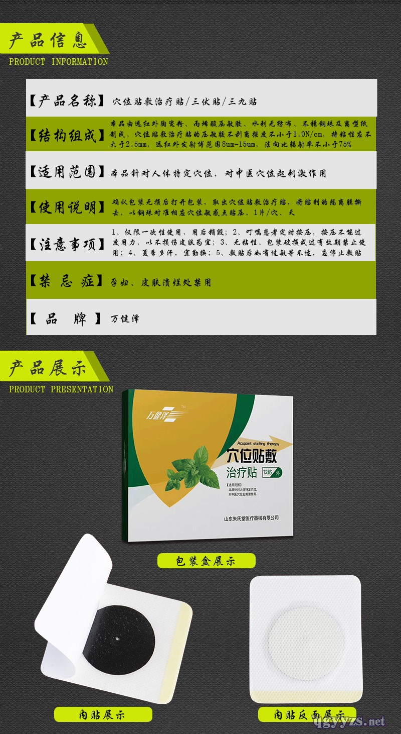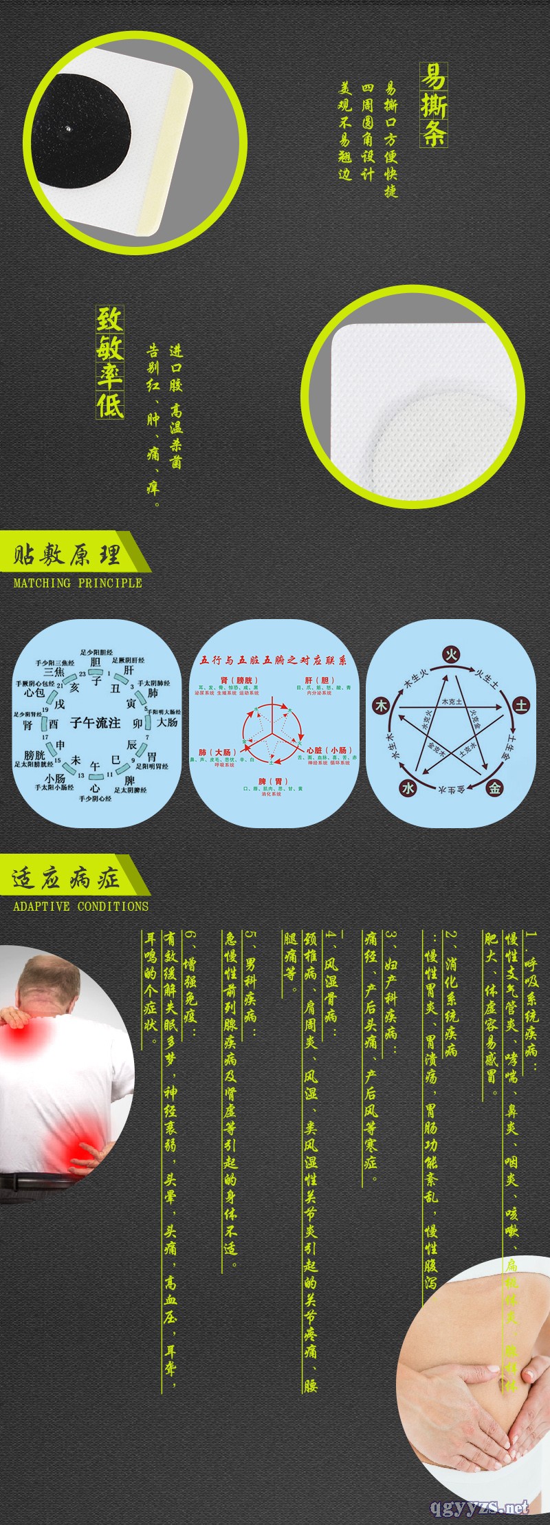 | 使用方法 | 確認包裝無損后打開包裝,取出穴位貼敷治療貼,將貼劑的隔離膜撕去,以鋼珠對準相應穴位敏感點貼壓,1片/穴、天 |