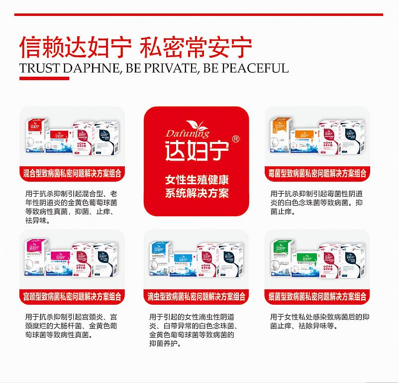 | 補充說明 | 達婦寧,專注私密健康!三步重?zé)ㄋ教幠贻p和健康的生殖健康系統(tǒng)解決方案: **步:洗護(洗液,直擊問題根源殺滅致病菌) 第二步:修復(fù)(凝膠,深徹修復(fù)滋養(yǎng)深入抑菌,修復(fù)私密健康生態(tài)環(huán)境) 第三步:養(yǎng)護(護理液,滋潤養(yǎng)護,保持年輕態(tài),男女同用,預(yù)防交叉) 產(chǎn)品不含抗生素激素,健康**,只殺有害菌,保護有益菌,提升免疫力! |