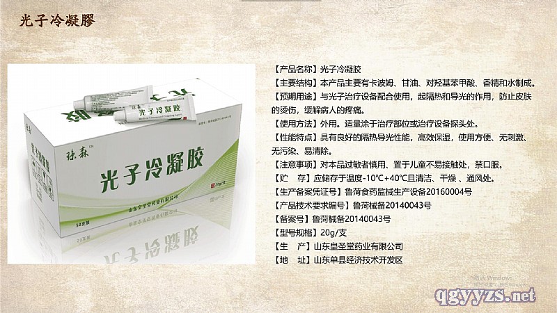 | 補(bǔ)充說明 | 【主要結(jié)構(gòu)】本產(chǎn)品主要有卡波姆、甘油、對(duì)羥基苯甲酸、香精和水制成。 【預(yù)期用途】與光子治療設(shè)備配合使用,起隔熱和導(dǎo)光的作用,防止皮膚的燙傷,緩解病人的疼痛。 【性能特點(diǎn)】具有良好的隔熱導(dǎo)光性能,高效保濕,使用方便、無污染、易清除。 【注意事項(xiàng)】對(duì)本品過敏者慎用、置于兒童不易接觸處,禁口服。 【貯存】應(yīng)儲(chǔ)存于溫度-10℃+40℃且清潔、干燥、通風(fēng)處。 【生產(chǎn)備案憑證號(hào)】魯菏食藥監(jiān)械生產(chǎn)設(shè)備20160004號(hào) 【產(chǎn)品技術(shù)要求編號(hào)】魯菏械備20140043號(hào) 【備案號(hào)】魯菏械備20140043號(hào) 【型號(hào)規(guī)格】20g/支 【生產(chǎn)】山東皇圣堂藥業(yè)有限公司 |