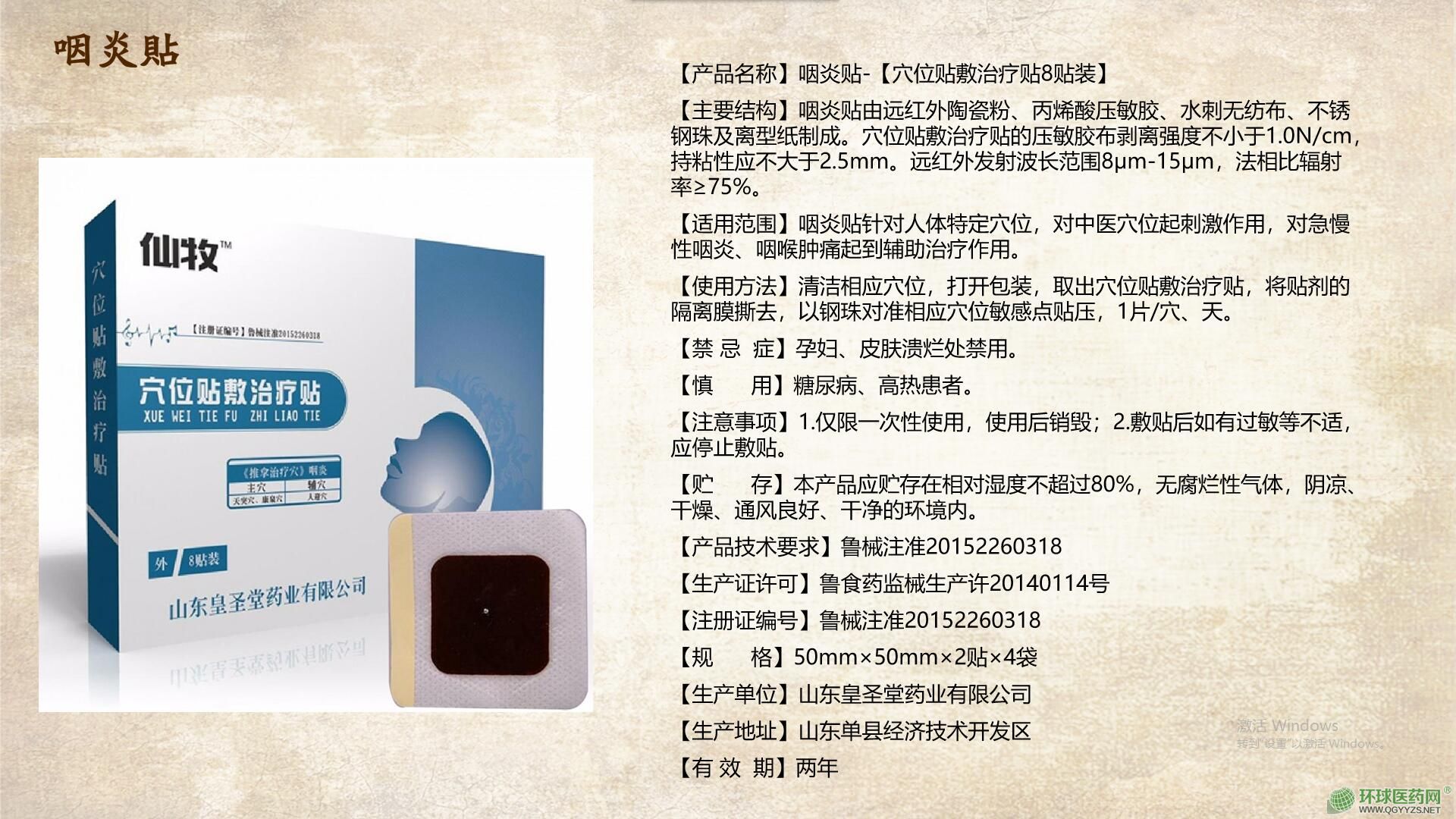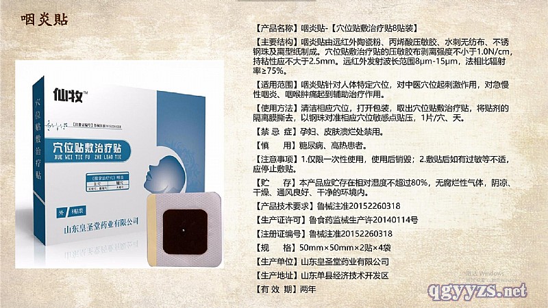 | 作用機(jī)理 | 咽炎貼針對(duì)人體特定穴位,對(duì)中醫(yī)穴位起刺激作用,對(duì)急慢性咽炎、咽喉腫痛起到輔助治療作用。咽炎貼由遠(yuǎn)紅外陶瓷粉、丙烯酸壓敏膠、水刺無(wú)紡布、不銹鋼珠及離型紙制成。穴位貼敷治療貼的壓敏膠布剝離強(qiáng)度不小于1.0N/cm,持粘性應(yīng)不大于2.5mm。遠(yuǎn)紅外發(fā)射波長(zhǎng)范圍8μm-15μm,法相比輻射率≥75%。咽炎貼用法用量:清潔相應(yīng)穴位,打開包裝,取出穴位貼敷治療貼,將貼劑的隔離膜撕去,以鋼珠對(duì)準(zhǔn)相應(yīng)穴位敏感點(diǎn)貼壓,1片/穴、天。 |