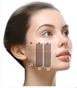 | 補充說明 | 面部畫線 1. 標注額顳分界線 2. 沿著眶下緣及眶外側(cè)緣畫線 3. 標注淚溝韌帶+顴皮韌帶 4. 連接鼻翼上緣、顴骨高點、顴弓處三點定一線 5. 口角旁開1.5cm(紅色區(qū)域),此區(qū)域為神經(jīng)分布 密集區(qū)域,治療時需避開 6. 沿著鼻唇溝畫線 7. 耳屏前開1.5cm(紅色區(qū)域),此區(qū)域為三叉神經(jīng) 淺表區(qū)域,治療時需避開 8. 沿著下頜骨緣上0.5cm畫線(下頜線) 9. 連接下頜角和耳屏前1.5cm標記點 10. 將畫線區(qū)域內(nèi)縱向分成3段,每段寬度約2-2.5cm 11. 再橫向分成3段,每段寬度約2-2.5cm,形成九宮格 |