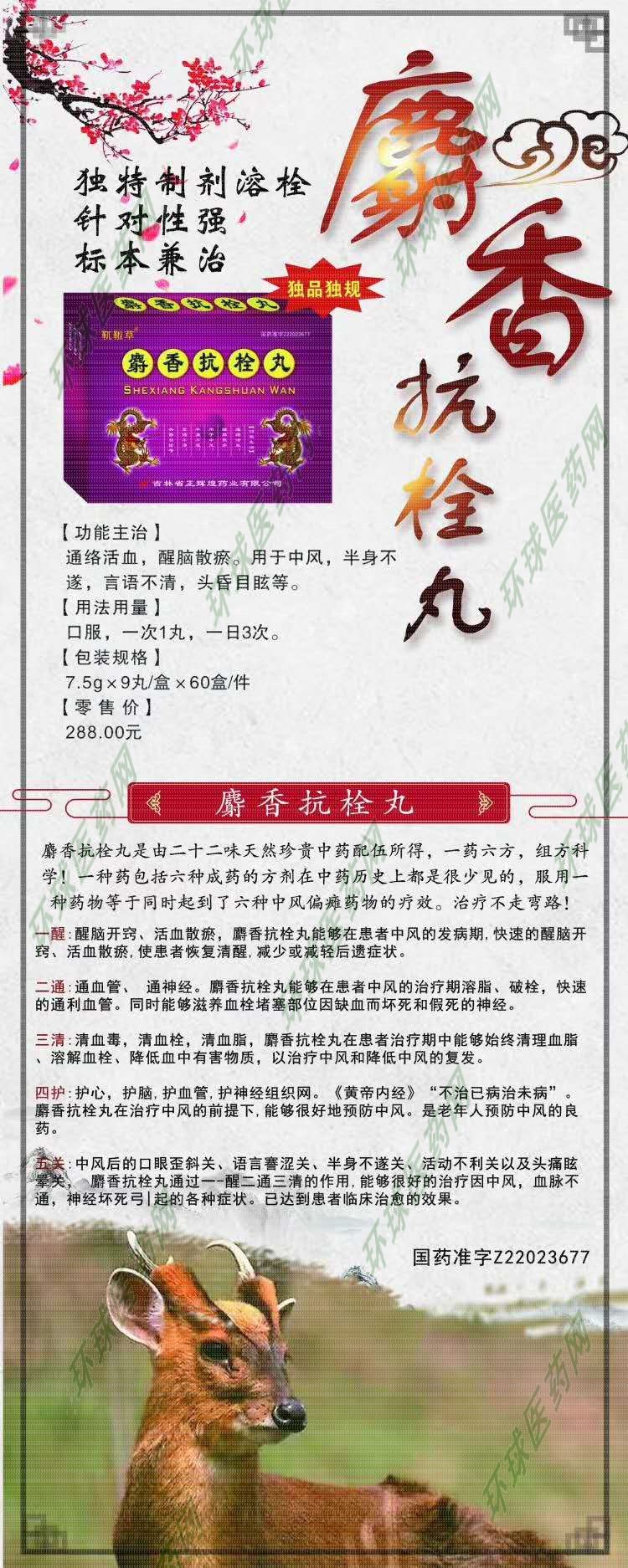 | 產(chǎn)品賣點(diǎn) | 麝香抗栓丸 全國經(jīng)營,獨(dú)品獨(dú)規(guī)獨(dú)劑型, 多年臨床,專治血栓偏癱。 控銷模式黃金產(chǎn)品,全國空白區(qū)域誠招**代理,不掛網(wǎng)不夸區(qū)域銷售,統(tǒng)一維護(hù)零售價(jià)。腦血栓疾病專用藥,大組方,獨(dú)特制劑溶栓,針對(duì)性強(qiáng),標(biāo)本兼治。另有學(xué)術(shù)支持! |