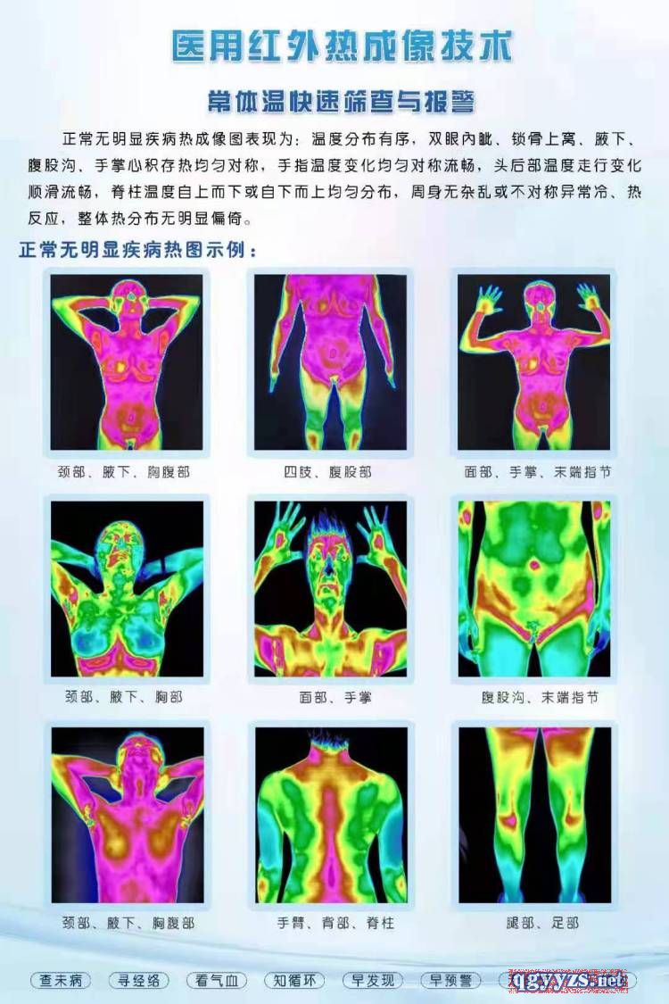 | 產品用途 | 理論分析和實驗研究表明.不僅太陽光中有紅外線,而且任何溫度高于**零度的物體都在不停地輻射紅外線。就是冰和雪,因為它們的溫度也遠遠高于**零度(即一273.15℃),所以也在不斷地輻射紅外線。換句話說,任何“熱”的物體雖然不發(fā)光但都能輻射紅外線,因此紅外線又稱為熱輻射線,簡稱熱輻射。 人是恒溫動物,能維持一定體溫,并不斷向四周空間發(fā)散紅外輻射能。因生理結構、體表各處溫度不等,而當人體某處發(fā)生病變或生理狀況發(fā)生變化時,必將因其血流和代謝變化而產生高于或低于正常溫度的偏離。如某組織處于慢性疾病、血供不足或局部壞死狀態(tài)時,其代謝熱強度偏低;而在疼痛、增生、炎癥、腫瘤等情況時,代謝強度則會偏高。 根據這一理論研發(fā)的人體代謝熱成像系統(tǒng),可以測定人體溫度的變化,作為臨床醫(yī)學診斷的指標。 醫(yī)用紅外熱成像技術,就是極其敏感地(小于0.05℃)接收人體細胞新陳代謝所產生的熱輻射。通過特有的成像和“由表及里”的層析技術,測定體內異常熱源的分布、深度、強度、形態(tài)及走勢,從而**、真實、動態(tài)地反映由人體代謝熱所表達的整體健康狀況。醫(yī)用紅外熱像儀在亞健康、疼痛、中醫(yī)研究、腫瘤等領域有著巨大的 |