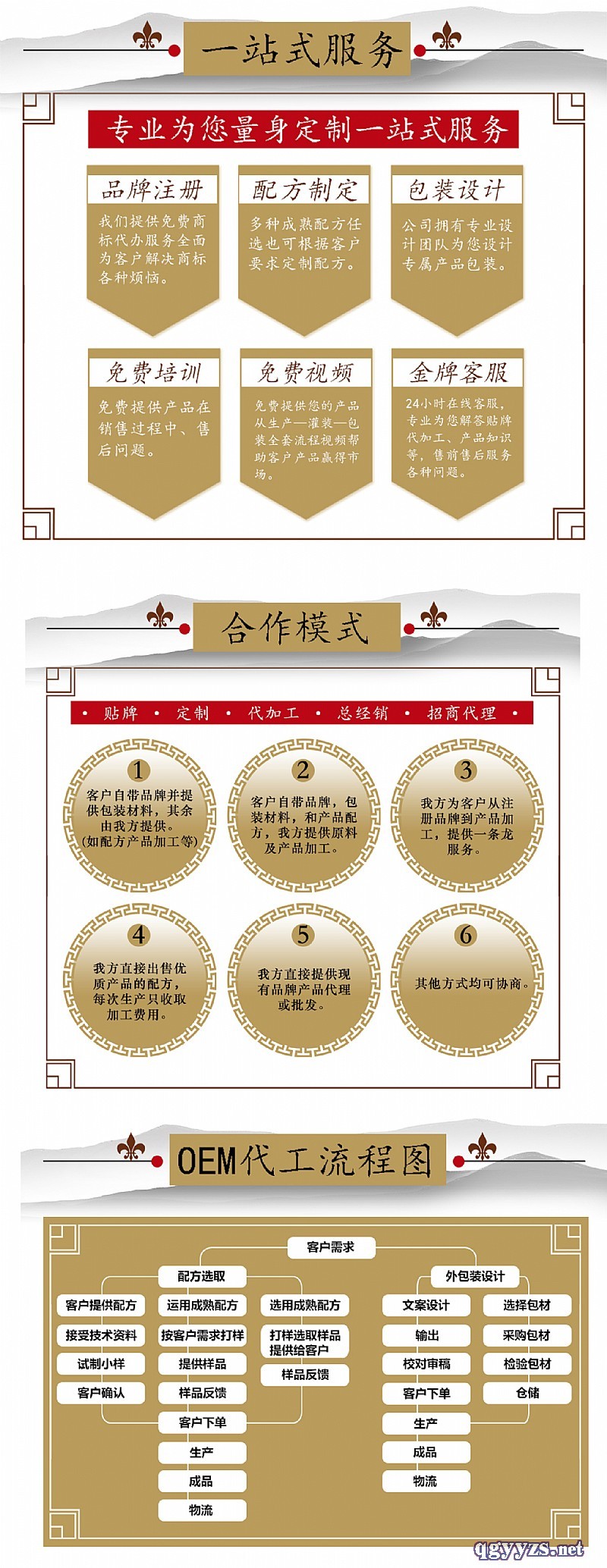 - 美芙康生物為您提供完整的OEM貼牌加工服務(wù),產(chǎn)品策劃(劑型、配方、工藝制定)、商標(biāo)注冊(cè)、專利申報(bào)、包裝設(shè)計(jì)、產(chǎn)品注冊(cè)備案審批、下單生產(chǎn)、檢驗(yàn)出廠、全程無憂一件代發(fā)。膏滋,固體飲料,袋用茶,壓片糖果等