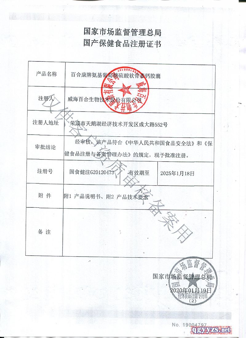 | 補(bǔ)充說(shuō)明 | 本品是以碳酸鈣、D-氨基葡萄糖鹽酸鈣、硫酸軟骨素鈉、硬脂酸鎂維主要原料制成保健食品,經(jīng)動(dòng)物功能試驗(yàn)證明,具有增加骨密度的保健功能,保健功能:增加骨密度,適宜人群:中老年、服用方法:每日2次、每次3粒、口服、規(guī)格:0.5g/粒、保質(zhì)期:24個(gè)月、不適宜人群:嬰幼兒、孕婦、乳母 |