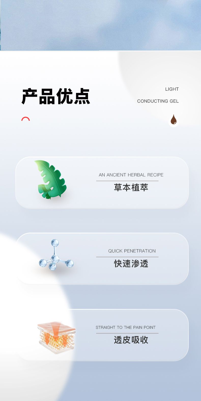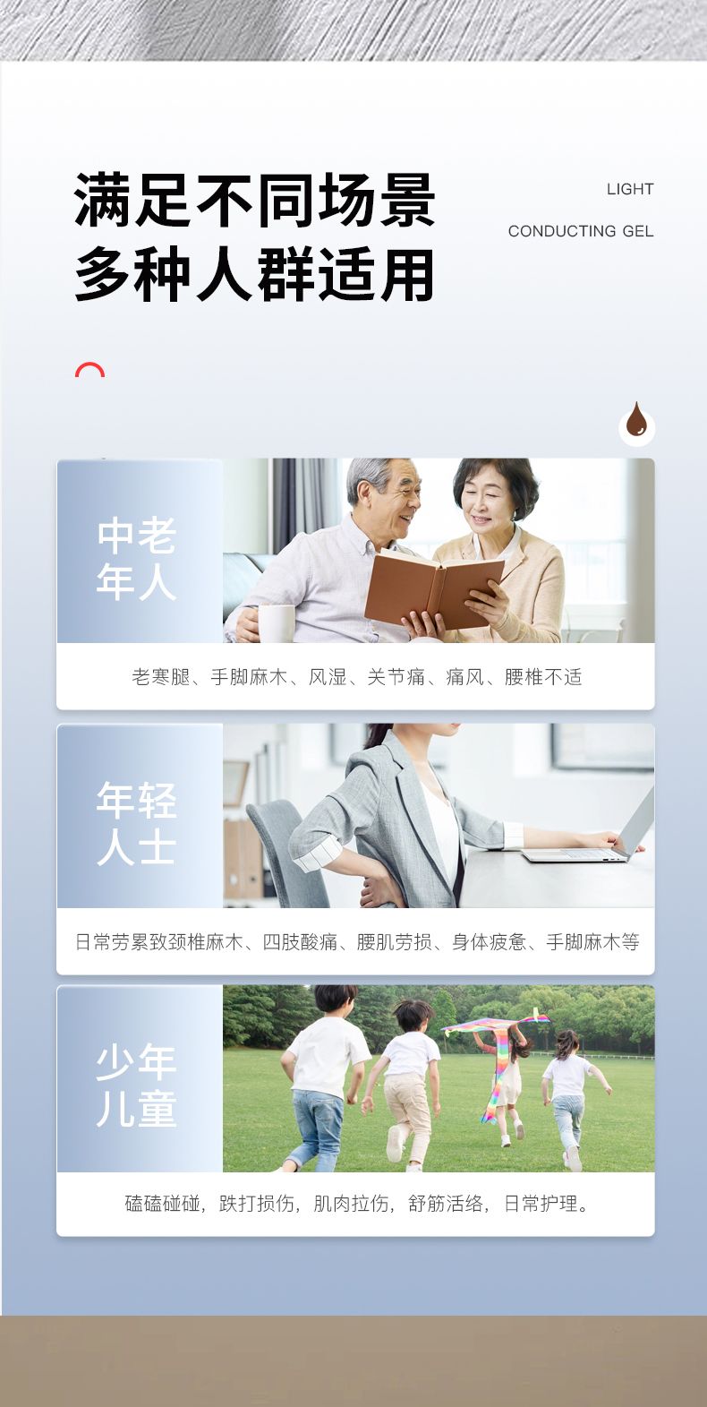 | 產(chǎn)品用途 | 用于肩周炎、關(guān)節(jié)炎(非急性期)、頸椎病、腰椎間盤突出、腰肌勞損、骨質(zhì)增生、腱鞘炎、扭挫傷(非急性期)引起不適癥狀的輔助治療。用于光子治療過程中隔熱和導(dǎo)光,與光子治療設(shè)備配合使用。 |
