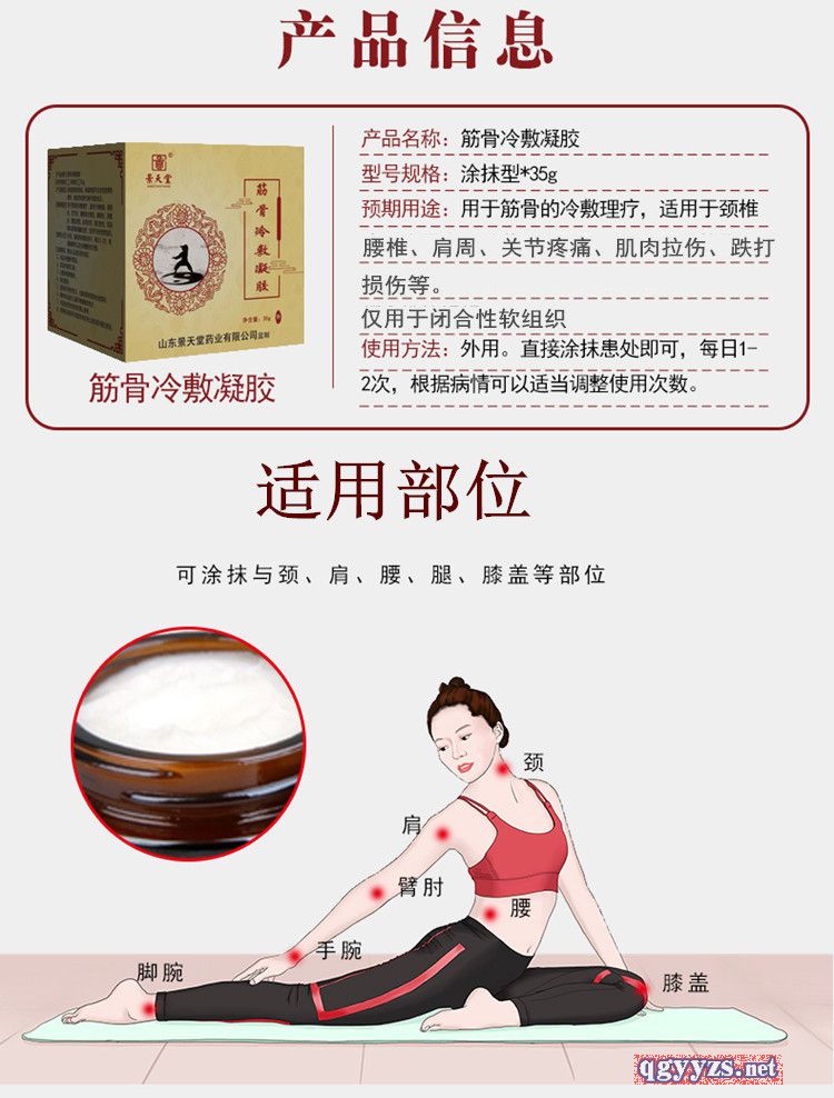 | 產(chǎn)品用途 | 用于筋骨的冷敷理療,適用于頸椎病、肩周炎、關(guān)節(jié)炎、腰肌勞損、肌肉拉傷、跌打損傷、風(fēng)濕類風(fēng)濕等的輔助治療。僅用于閉合性軟組織。 |
