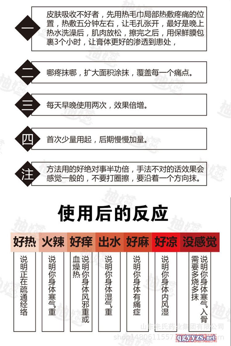 | 補(bǔ)充說(shuō)明 | 好熱:說(shuō)明正在疏通經(jīng)絡(luò) 火辣:說(shuō)明您身體寒氣重 好癢:說(shuō)明你身體風(fēng)邪重或血燥熱 出水:說(shuō)明您身體有痛癥 好麻:說(shuō)明您身體有痛癥 好涼:說(shuō)明您身體內(nèi)風(fēng)濕 沒(méi)感覺(jué):說(shuō)明您身體寒氣入骨需要多燒多抹 |