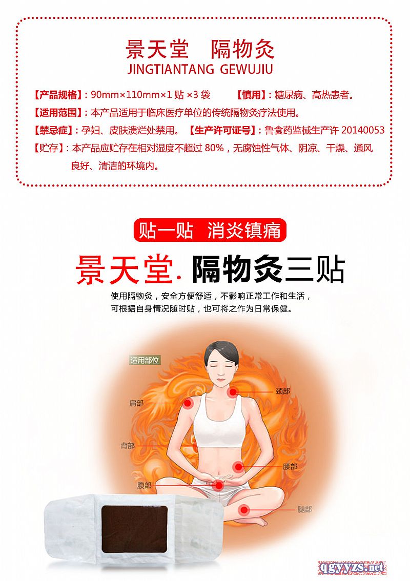 | 補(bǔ)充說(shuō)明 | 1、隔物灸為外用灸貼,切忌內(nèi)服,請(qǐng)勿讓三歲以下小兒隨意接觸; 2、承重貨受壓部位(如睡覺(jué)時(shí)頸部、背部、腰部、承受的壓力為加重),謹(jǐn)防燙傷; 3、少數(shù)對(duì)醫(yī)用膠過(guò)敏者,可將護(hù)翼剪短或完全剪掉自行固定,不影響效果; 4、不使用請(qǐng)不要撕開(kāi)內(nèi)袋,一旦撕開(kāi)內(nèi)袋,產(chǎn)品會(huì)自行發(fā)熱; 5、正常使用時(shí),極少數(shù)患者使用后起泡(故稱(chēng)灸瘢),可用消毒針挑破,放出積液,一般涂擦抗菌藥膏3-5天可愈,嚴(yán)重者或遵醫(yī)囑,痊愈后可繼續(xù)使用; 6、糖尿病患者和有末梢循環(huán)障礙者,使用時(shí)請(qǐng)遵醫(yī)囑,過(guò)敏體質(zhì)者慎用; 7、24小時(shí)急性創(chuàng)傷的局部、皮膚破損、高熱患者、急性期炎癥患者、孕婦下腹部、血友病患者、活動(dòng)性結(jié)核患者、惡性腫瘤患者禁用。 8、使用熱敷貼后如有不適,請(qǐng)暫停使用或遵醫(yī)囑。 |