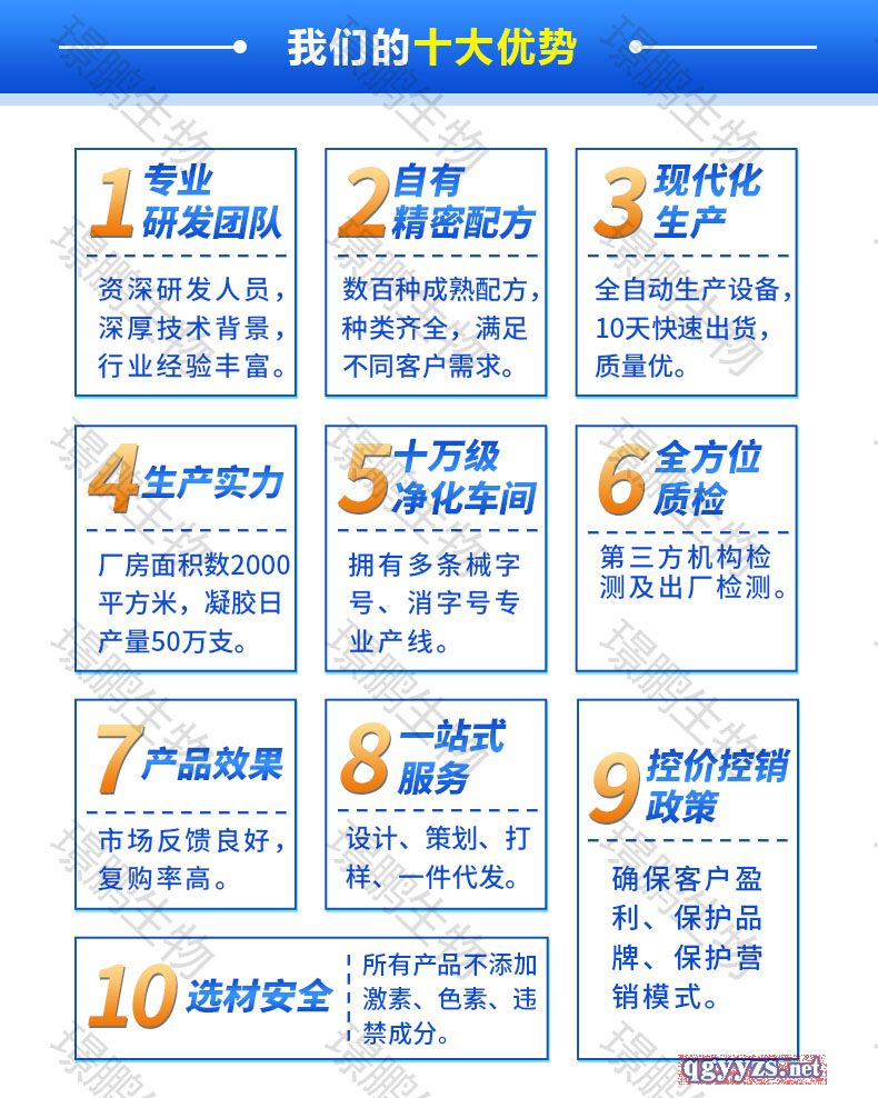| 其它說(shuō)明 | 10大優(yōu)勢(shì) 1.專業(yè)研發(fā)團(tuán)隊(duì):**研發(fā)人員,深厚技術(shù)背景,行業(yè)經(jīng)驗(yàn)豐富 2.自有精密配方:配方成熟,種類齊全,滿足不同客戶需求 3.現(xiàn)代化生產(chǎn):全自動(dòng)生產(chǎn)設(shè)備,7天快速出貨,質(zhì)量?jī)?yōu)。 4.生產(chǎn)實(shí)力:廠房面積數(shù)千平方米,凝膠日產(chǎn)量100萬(wàn)支。 5.十萬(wàn)級(jí)凈化車間:擁有多條械字號(hào)、消字號(hào)專業(yè)產(chǎn)線 6.全方位質(zhì)檢:廠方燈檢及第三方檢測(cè)機(jī)構(gòu)檢測(cè),嚴(yán)格把控產(chǎn)品質(zhì)量 7.產(chǎn)品效果:市場(chǎng)反饋良好,復(fù)產(chǎn)率高。 8.一站式服務(wù):完整的OEM貼牌加工服務(wù)。 9.控價(jià)控銷政策:完善的市場(chǎng)保護(hù)政策,確?蛻粲那疤嵯,保護(hù)客戶市場(chǎng)權(quán)益。 10.選材可靠:公司**產(chǎn)品均不添加激素、色素等。 |