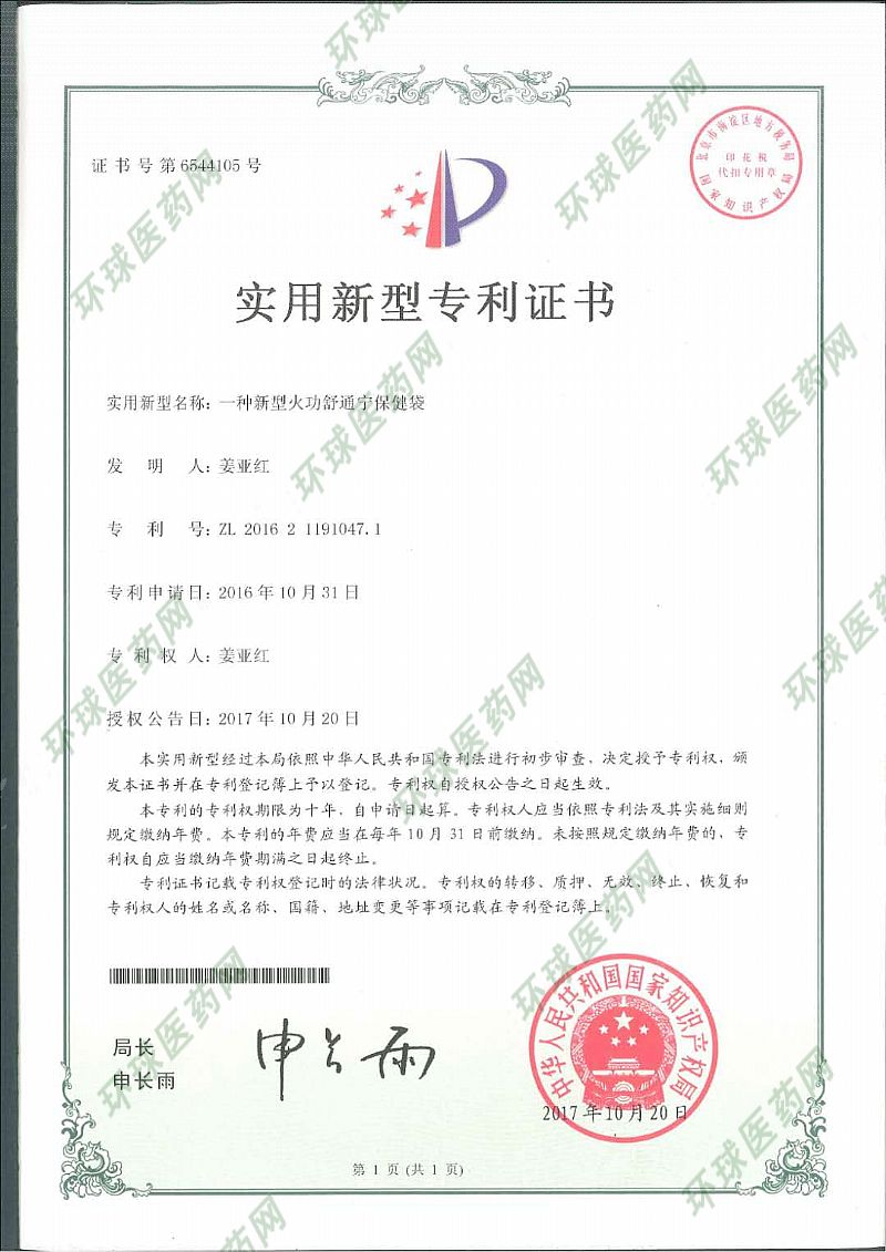 | 補充說明 | “火功”醫(yī)療方法歷史悠久,遠至東漢,距今兩千年歷史,是祖國醫(yī)學寶庫中富有特色的一種醫(yī)療方法。 1992年在全國首屆中醫(yī)特色醫(yī)療學術研討會; 1993年海峽兩岸首屆學術研討會; 1994年在全國第三屆?茖2W術研討會; 1997年“火功舒通寧袋”取得國家頒發(fā)的專利證書(專利號971085528) 1997年在中國**醫(yī)術研討會所撰寫的論文獲得了優(yōu)秀論文和一等獎; 論文編入《臨床專病治驗輯要》《中國名醫(yī)良藥實用辭典》《中華**醫(yī)術》等書; 2008年中國醫(yī)療保健國際交流促進全國專業(yè)委員會特邀做學術交流;中央電視臺《健康之路》、寶雞電視臺科技專欄均播放了治療實況; 2016年,取得省食藥局批準文號<陜健用證字1604000> |