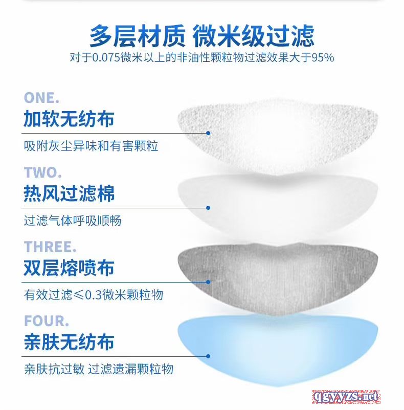 | 產(chǎn)品賣點(diǎn) | 多層材質(zhì)微米級(jí)過濾 對(duì)于0.075微米以上的非油性顆粒物過濾效果大于95% 一、加軟無紡布:吸附灰塵異味和有害顆粒 二、熱風(fēng)過濾棉:過濾氣體呼吸順暢 三、雙層熔噴布:有效過濾≤0.3微米顆粒物 四、親膚無紡布:親膚抗過敏,過濾遺漏顆粒物 |