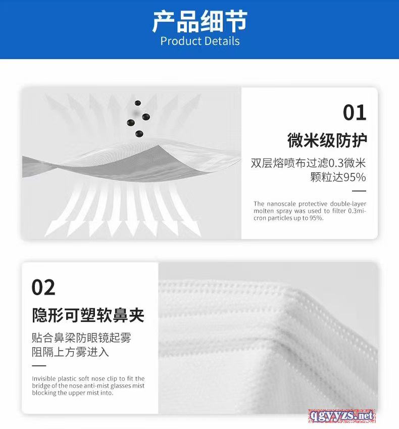 | 補(bǔ)充說明 | 一、微米級(jí)防護(hù):雙層熔噴布過濾0.3微米,顆粒達(dá)95% 二、隱形可塑軟鼻夾:貼合鼻梁防眼睛起霧阻隔上方霧進(jìn)入 三、側(cè)邊包邊工藝:柔軟海綿體貼合臉頰,阻隔兩側(cè)霧進(jìn)入 四、掛耳固定工藝:不易掉落,**防護(hù)一整天 |