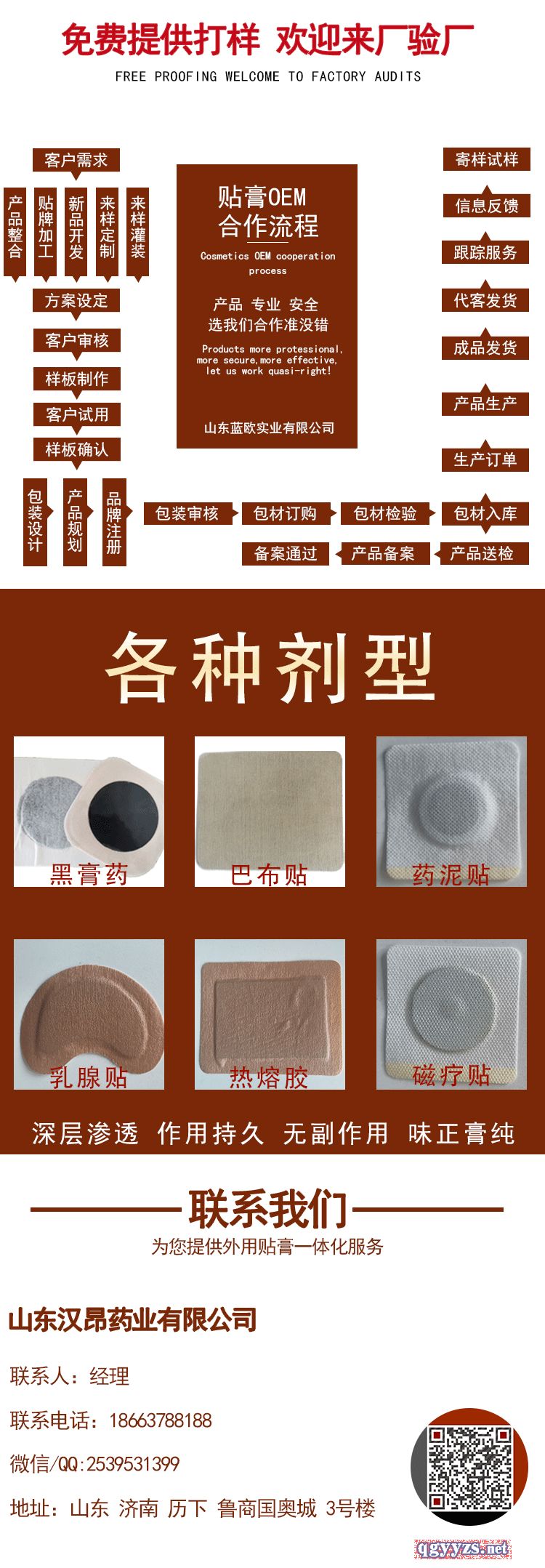 [主營(yíng)產(chǎn)品]:一類械字號(hào)加工工廠 一類械字號(hào)貼牌 膏藥加工工廠 貼劑加工工廠 貼膏加工工廠 膏貼加工工廠 噴劑加工 更多>