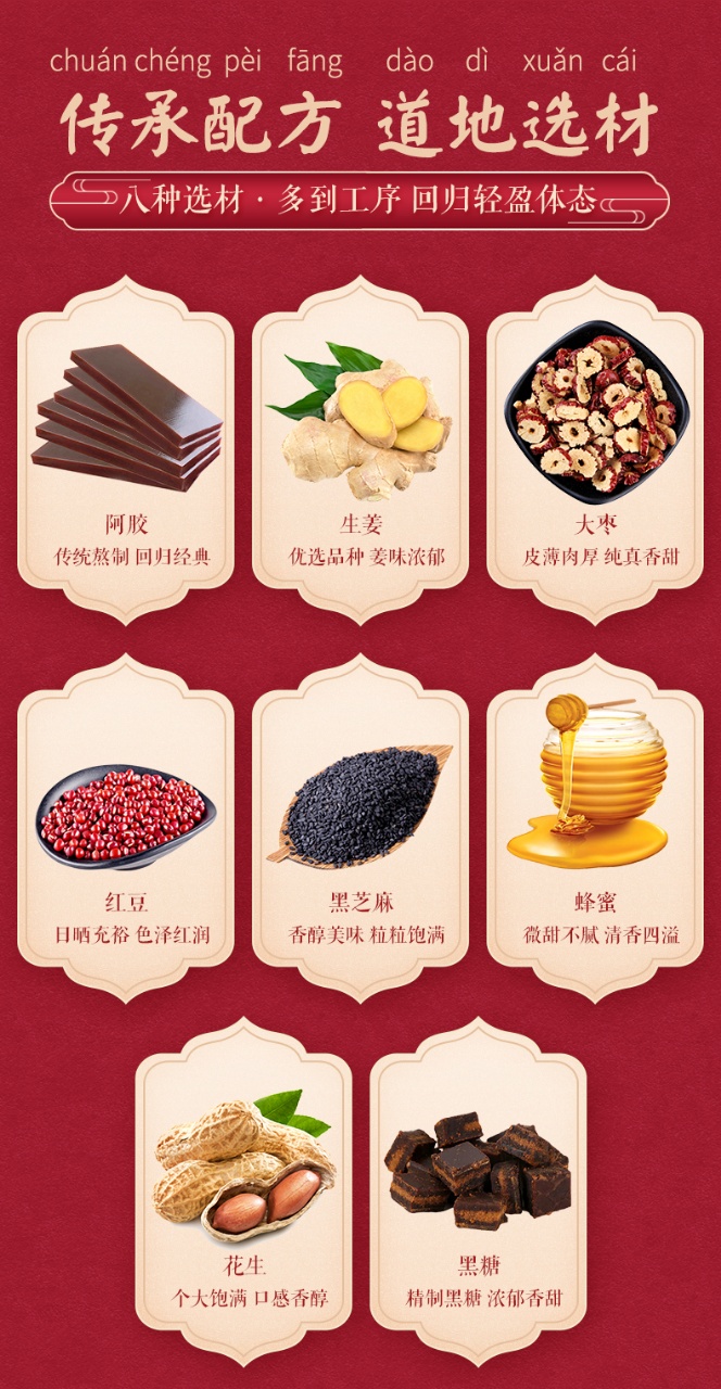 | 主要成分 | 阿膠、生姜、大棗、紅豆、芝麻、蜂蜜、花生、黑糖 |