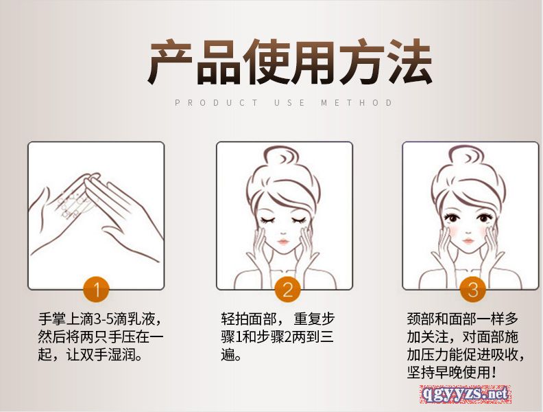 | 使用方法 | 潔面后,用同系列調(diào)理水和精華,在取出適量的乳液用指腹的力量,哪里最干就先涂抹哪里,先涂抹兩頰、嘴角兩側(cè)、上下顎,這些部位涂完之后再涂全臉,讓干燥的部位得到雙重滋潤。涂抹完后,從臉的中央部位向外做輕輕的按摩推開,直至被皮膚完全吸收 |