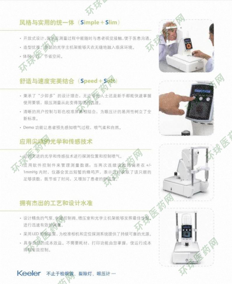 | 補(bǔ)充說(shuō)明 | 非接觸臺(tái)式眼壓計(jì)4S—芯經(jīng)典 型時(shí)尚Simple — 結(jié)構(gòu)優(yōu)化、操作簡(jiǎn)捷Slim — 開放式設(shè)計(jì)、造型優(yōu)雅Speed — 更短學(xué)習(xí)曲線、更快檢測(cè)速度Soft — 醫(yī)患溝通輕松、噴氣柔和自然 風(fēng)格與實(shí)用的統(tǒng)一體(Simple+Slim)• 開放式設(shè)計(jì),醫(yī)生在測(cè)量過(guò)程中能隨時(shí)與患者視覺接觸,便于醫(yī)患溝通。• 造型優(yōu)雅、簡(jiǎn)潔的光學(xué)主機(jī)架能夠天衣無(wú)縫地融入臨床環(huán)境。• 體積小巧、節(jié)省空間。舒適與速度完美結(jié)合(Speed+Soft)• 秉承了“少即多”的設(shè)計(jì)理念,無(wú)論專業(yè)人士還是新手都能快速掌握使用要領(lǐng),眼壓測(cè)量從此變得簡(jiǎn)便而迅速。• 清晰的用戶控制與彩色校準(zhǔn)屏幕相結(jié)合,為眼壓計(jì)的易用性樹立了全新標(biāo)準(zhǔn)。• Demo 功能讓患者預(yù)先感知噴氣過(guò)程,噴氣柔和自然。應(yīng)用**的光學(xué)和傳感技術(shù)• 應(yīng)用先進(jìn)的光學(xué)和傳感技術(shù)進(jìn)行探測(cè)位置和控制噴氣。• 應(yīng)用軟件控制件來(lái)管理測(cè)量數(shù)據(jù); |