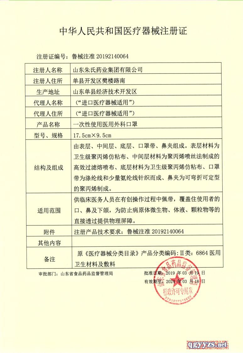 | 補(bǔ)充說(shuō)明 | 【規(guī)格型號(hào)】14.5cm×9.5cm、17.5cm×9.5cm 【規(guī)格】1000只/件,10只/包 【執(zhí)行標(biāo)準(zhǔn)號(hào)】YY0469-2011* 【材質(zhì)】共三層: 表層材料(聚丙烯紡粘布) 中間材料:過(guò)濾熔噴布(超細(xì)纖維) 底層材料:聚丙烯紡粘布 【主要結(jié)構(gòu)組成或者成分】由表層、中間層、底層、口罩帶、鼻夾組成。表層材料為聚丙烯紡粘布、中間層材料為聚丙烯噴絲法制成的過(guò)濾熔噴布、底層材料為聚丙烯紡粘布,口罩帶為滌綸線和少量氨綸線針織而成、鼻夾為可彎折可定型的聚丙烯制成。 【適用范圍】供臨床醫(yī)務(wù)人員在有創(chuàng)操作過(guò)程中佩帶,覆蓋住使用者的口、鼻及下頜,為防止病原體微生物、體液、顆粒物等的直接透過(guò)提供物理屏障。 |
