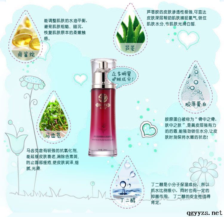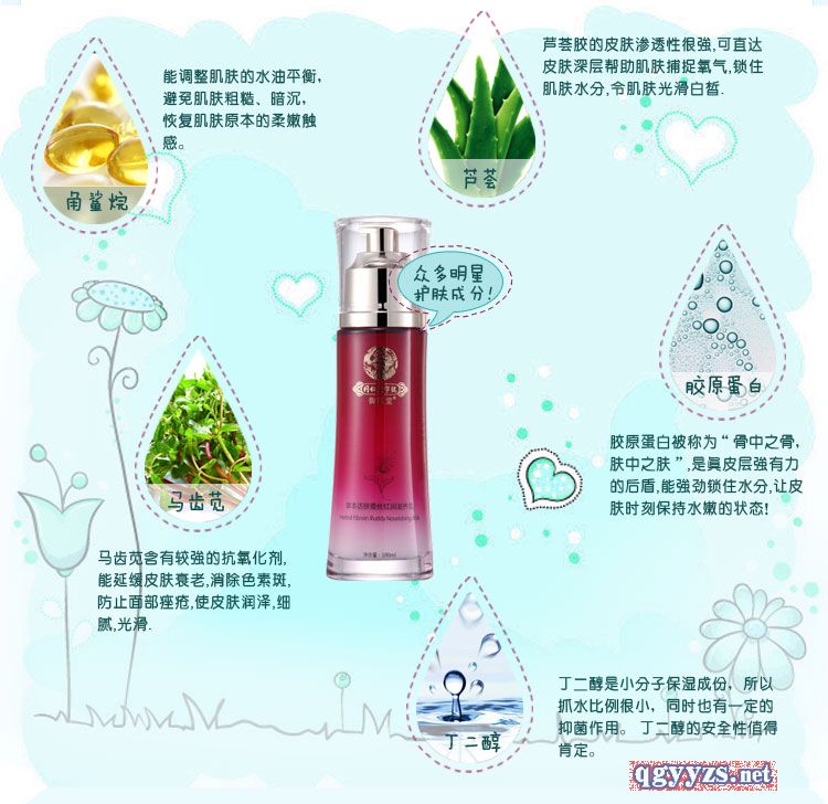 | 補(bǔ)充說明 | 適用于缺水干燥、松馳、老化等**類型肌膚,萃取人參、積雪草、蘆薈等多種中草藥提取物精華,補(bǔ)水保濕舒緩修護(hù)滋養(yǎng)肌膚,改善肌膚松馳老化提拉緊致肌膚,增加肌膚的營養(yǎng)供應(yīng),發(fā)揮補(bǔ)氣養(yǎng)顏及活血的功效,同時(shí)還能提高免疫功能,防止肌膚收到外界環(huán)境的有害刺激,使面部肌膚細(xì)膩光滑讓皮膚純白嫩透。 |