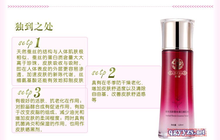 | 產(chǎn)品用途 | 配方**溫和,清新盈潤(rùn)的質(zhì)地,易于吸收。蠶絲蛋白含多種保濕因子(NMF)十倍于常規(guī)植物,給肌膚持續(xù)補(bǔ)充水分,滋養(yǎng)調(diào)理,促進(jìn)肌膚更新活力,提升整體健康度與光澤度。經(jīng)常使用,肌膚更加柔軟細(xì)滑,由內(nèi)而外綻放健康柔嫩光采。 |