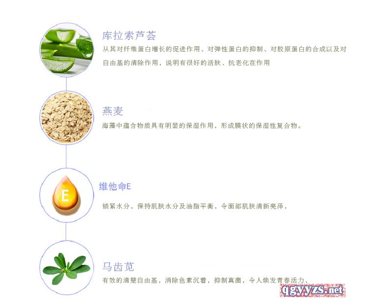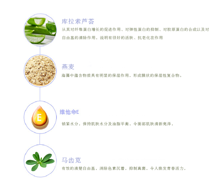 | 主要成分 | "庫(kù)拉索蘆薈(ALOEBARBADENSIS)葉汁","燕麥(AVENASATIVA)仁提取物","(辛甘醇,乳酸,生育酚(維生素E),PCA鈉,1,2-己二醇,水,透明質(zhì)酸)","甘油","馬齒莧(PORTULACAOLERACEA)提取物","丙二醇","羥乙基脲","(氯苯甘醚,苯氧乙醇) |