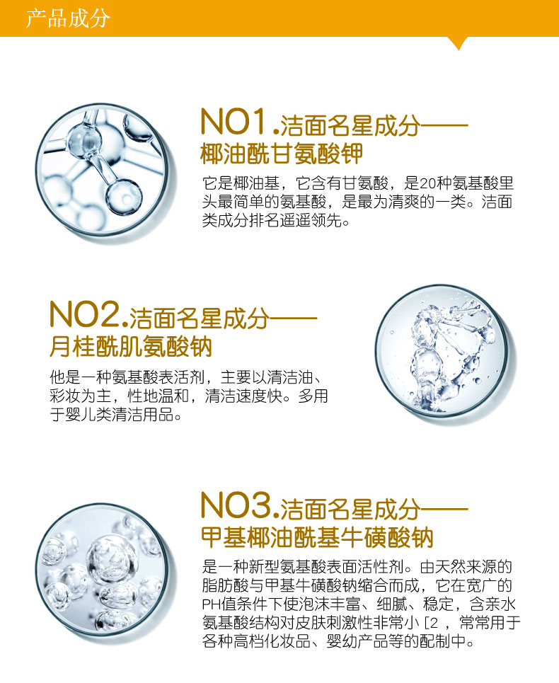 | 產(chǎn)品賣點(diǎn) | 潔面慕斯透明水狀質(zhì)地的清潔潔膚泡沫,按壓后會(huì)產(chǎn)生泡沫,不僅能快速洗去臉部彩妝及不潔物,并且能使肌膚變得更透明有光澤。能幫助老角質(zhì)的剝落卻完全不傷肌膚。 |