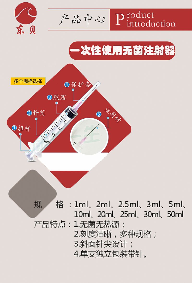 | 產(chǎn)品用途 | 【產(chǎn)品特點(diǎn)】無(wú)菌注射器材料嚴(yán)格按照標(biāo)準(zhǔn)執(zhí)行,經(jīng)環(huán)氧乙烷滅菌,無(wú)菌、無(wú)熱原;注射針頭采用醫(yī)用不銹鋼,斜口平整刃角,角度標(biāo)準(zhǔn)易穿刺,疼痛。换钊^與管壁貼合度高,與針頭接觸緊密,不易漏液;單只獨(dú)立包裝帶針;刻度清晰,多種規(guī)格;斜面針尖設(shè)計(jì),針尖鋒利,可使患者在接受注射時(shí)減輕痛感。 【適用范圍】適用于兒童喂藥,醫(yī)療使用,印刷加墨等。 |
