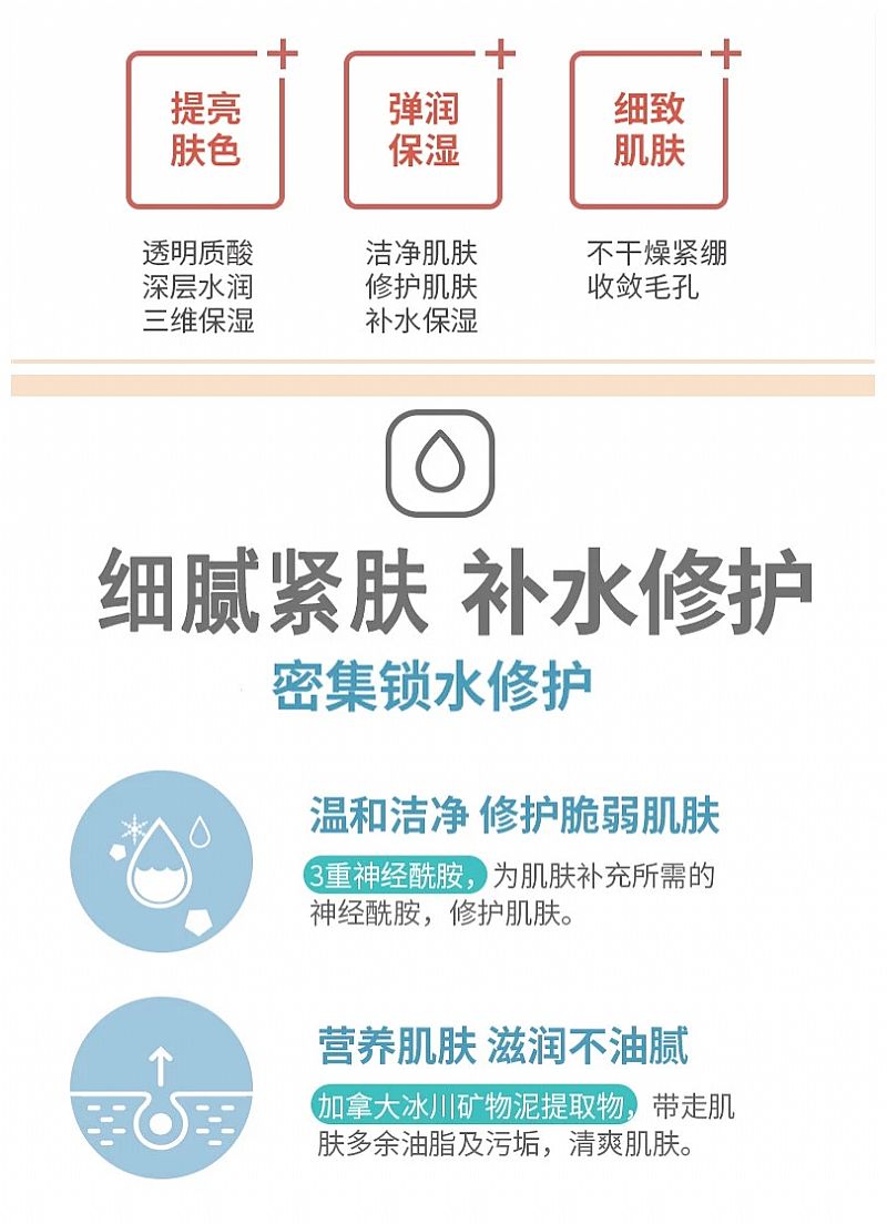 | 主要成分 | 水、丁二醇、丙二醇、甘油、煙酰胺、羥乙基纖維素、3-0乙基抗壞血酸、DMDM乙內(nèi)酰脲、甘草酸二鉀、EDTA二鈉、羥苯甲酯、透明質(zhì)酸鈉、香精 |