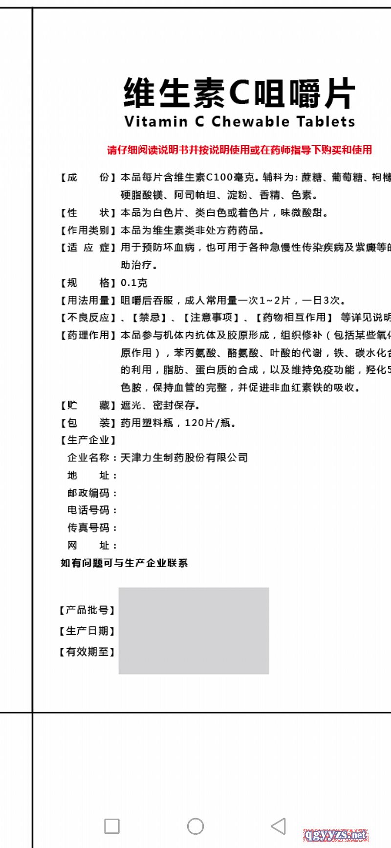 | 通用名稱 | 維生素C咀嚼片 |