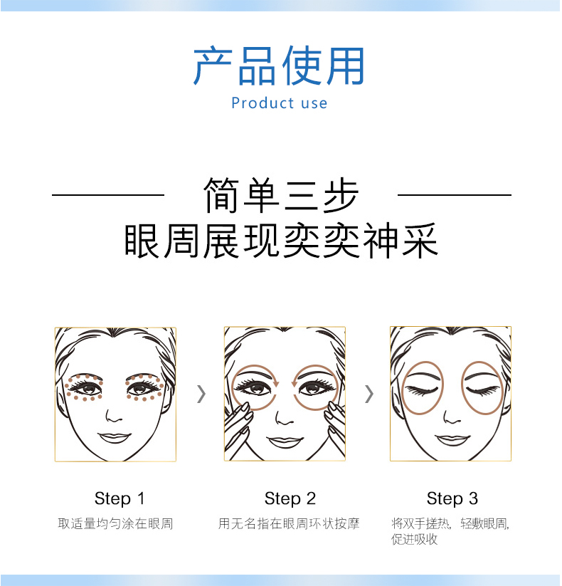 | 使用方法 | 輕壓泵頭取適量精華,以指腹輕輕涂抹于包括上眼瞼的整個部位,以畫圓方式從內(nèi)眼角平滑撫至眼睛下方,然后再回到上眼瞼 |