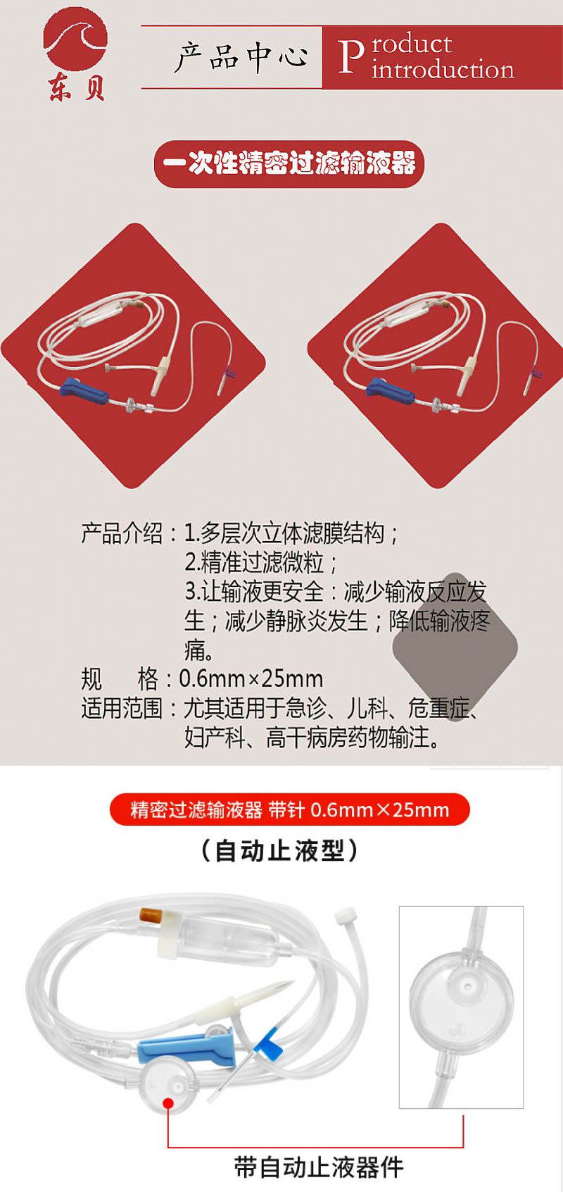 | 產(chǎn)品用途 | 1、過濾更精密,使用更方便。2、靈敏回血,使用更便捷。3、輸液中無氣泡,使用更放心。4、輸液完自動(dòng)防回血,使用更安心。5、輸液時(shí)不堵塞,流量大,使用更舒心。6、輸液完延緩回血,使用更省心。7、精密過濾,本品采用5微米或更致密的微孔過濾介質(zhì),能有效截留大輸液中常見的不溶性微粒,濾除率高。 |