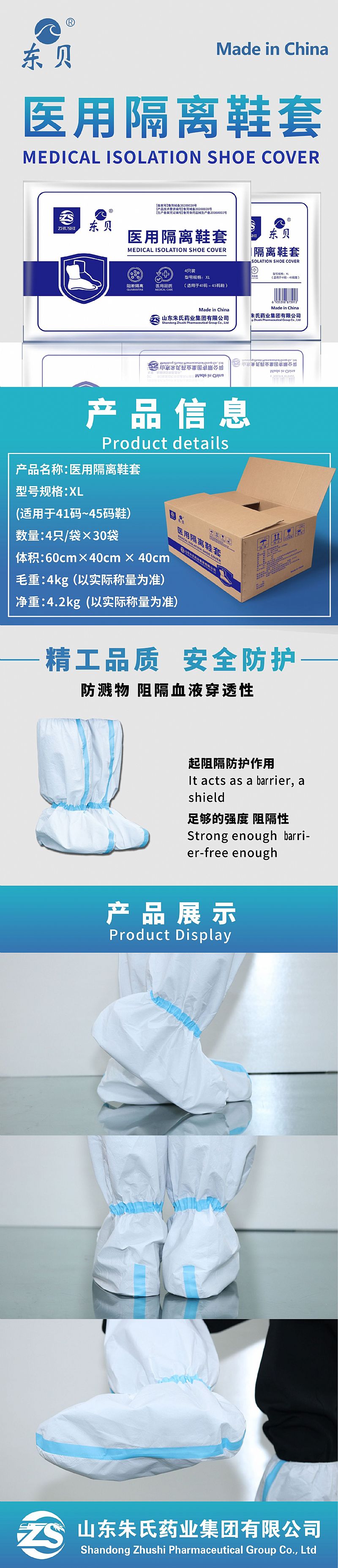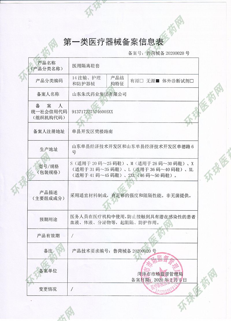 | 產(chǎn)品用途 | 【備案人名稱】山東朱氏藥業(yè)集團(tuán)有限公司 【生產(chǎn)企業(yè)】山東朱氏藥業(yè)集團(tuán)有限公司 【住所】單縣開發(fā)區(qū)樊樓路南 【生產(chǎn)地址】山東單縣經(jīng)濟(jì)技術(shù)開發(fā)區(qū)和山東單縣經(jīng)濟(jì)技術(shù)開發(fā)區(qū)單德路6號(hào)。 【售后服務(wù)機(jī)構(gòu)】山東朱氏藥業(yè)集團(tuán)有限公司 【儲(chǔ)運(yùn)條件】鞋套應(yīng)貯存在通風(fēng)干燥的室內(nèi),并不得與有毒﹑有害﹑有腐蝕性物質(zhì)混存。 |