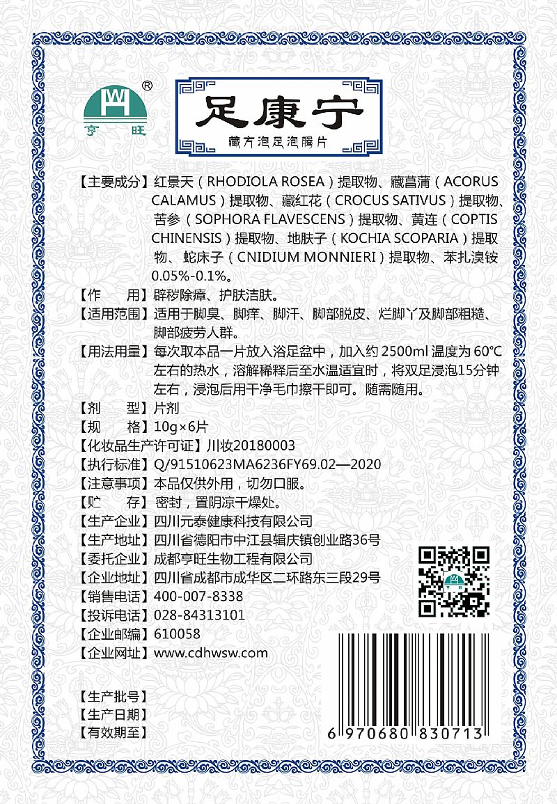 | 用法用量 | 每次取本品一片放入浴足盆中,加入約2500ml溫度為60℃左右的熱水,溶解稀釋后至水溫適宜時(shí),將雙足浸泡15分鐘左右,浸泡后用干凈毛巾擦干即可。隨需隨用。 |