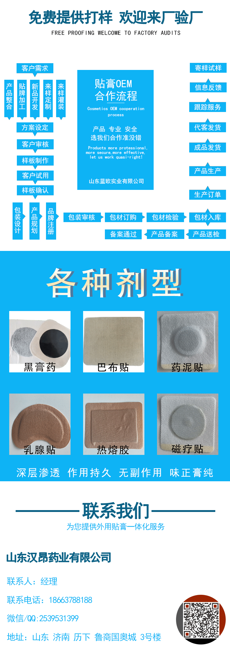 | 其它說明 | 膏藥生產(chǎn)源頭廠家OEM代加工招商加盟實(shí)力廠家代加工 OEM貼牌!代理!**豐厚。! 創(chuàng)業(yè)熱線:左經(jīng)理:15965631743 貼膏廠家---山東漢昂藥業(yè)有限公司,承接各類貼膏貼劑OEM貼牌和代加工業(yè)務(wù) 1.自主品牌“益慈林”(底價(jià)代理、批發(fā),**豐厚) 2. 產(chǎn)品有:磁療貼、理療貼、冷敷貼等(貼牌加工、代理,**豐厚) 3.婦科產(chǎn)品有:暖宮貼、痛經(jīng)貼、乳腺貼等(貼牌加工、代理,**豐厚) 4.兒科產(chǎn)品有:腹瀉貼、感冒貼、止咳貼等(貼牌加工、代理,**豐厚) 藥監(jiān)局可查,幫你打造一款屬于您自己的合法產(chǎn)品。 產(chǎn)品、**空間大,歡迎來電洽談。 |