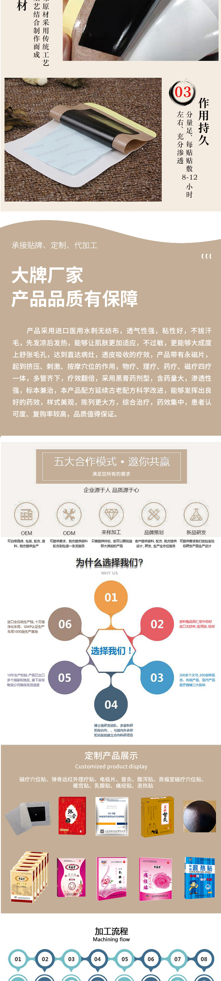 | 產(chǎn)品賣點 | 本產(chǎn)品采用進口醫(yī)用無菌無紡布,貼敷感舒適不刺激,進口醫(yī)用壓敏膠,不過敏,透氣性強,不拔汗毛,粘貼性強,根據(jù)中醫(yī)五行療法,能夠更好的使病灶部位加強血液流通,加快新陳代謝,科學(xué)療法,透皮吸收,結(jié)合物療,理療,藥療,遠(yuǎn)紅外療法,產(chǎn)品運用全新技術(shù),先發(fā)涼后發(fā)熱,使皮膚毛孔達(dá)到吸收,,對于各類疼痛有較好的輔助治療功效。七大分型,陳設(shè)美觀大方,走貨量大,**空間高 |