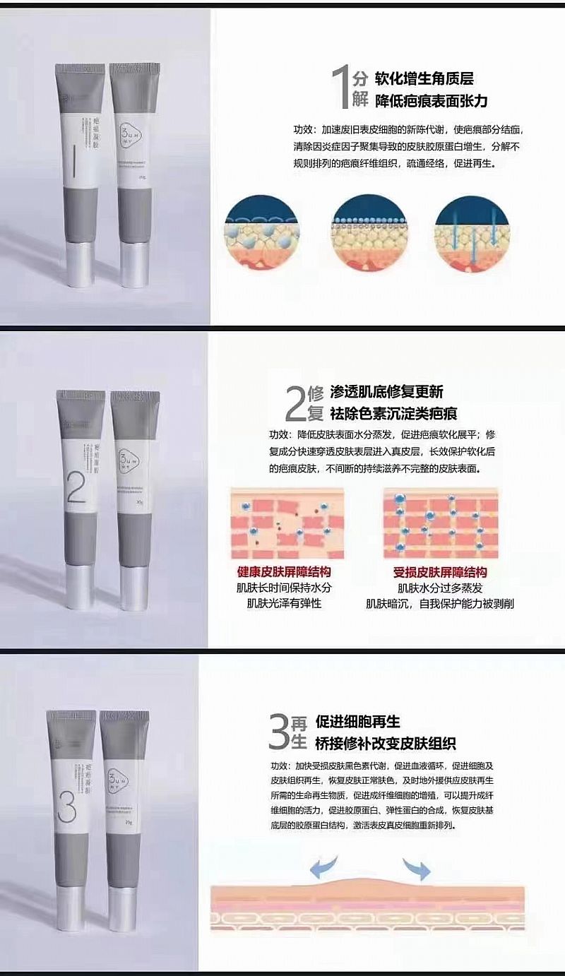 | 產(chǎn)品賣點(diǎn) | 1、定向祛疤效果好,適合多種類型疤痕。 2、二類6864醫(yī)療器械藥監(jiān)局備案,可進(jìn)醫(yī)院,多地掛網(wǎng) 3、外包裝采用已拉棉絮環(huán)保紙,內(nèi)包裝采用鋁塑瓶灰的理念,灰的優(yōu)雅,灰色的內(nèi)斂 |