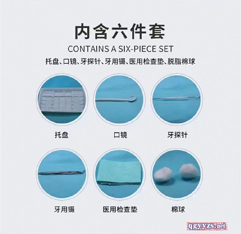 | 主要成分 | 通常由托盤、口鏡、牙探針、牙用鑷、醫(yī)用檢查墊、脫脂棉球、檢查手套、吸唾管、水槍頭組成,非無菌提供,一次性使用。 |