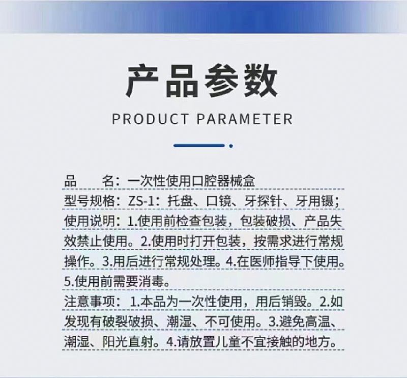 | 產(chǎn)品規(guī)格 | ZS-1:托盤、口鏡、牙探針、牙用鑷; ZS-2:托盤、口鏡、牙探針、牙用鑷、脫脂棉球等 |