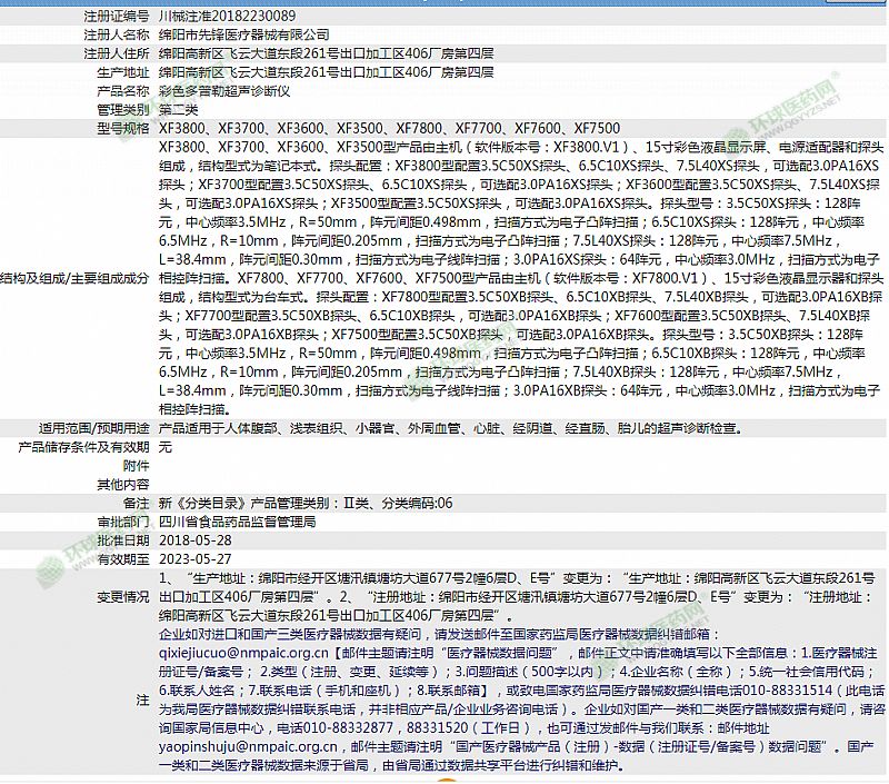 | 主要成分 | XF3800、XF3700、XF3600、XF3500型產品由主機(軟件版本號:XF3800.V1)、15寸彩色液晶顯示屏、電源適配器和探頭組成,結構型式為筆記本式。探頭配置:XF3800型配置3.5C50XS探頭、6.5C10XS探頭、7.5L40XS探頭,可選配3.0PA16XS探頭;XF3700型配置3.5C50XS探頭、6.5C10XS探頭,可選配3.0PA16XS探頭;XF3600型配置3.5C50XS探頭、7.5L40XS探頭,可選配3.0PA16XS探頭;XF3500型配置3.5C50XS探頭,可選配3.0PA16XS探頭 |