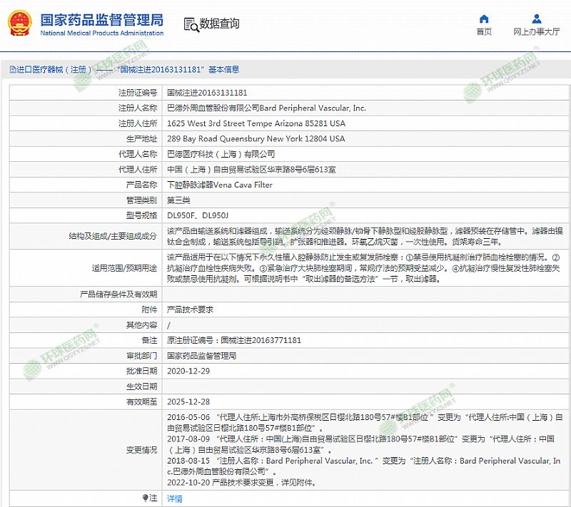生產(chǎn)企業(yè): Bard Peripheral Vascular, Inc.
